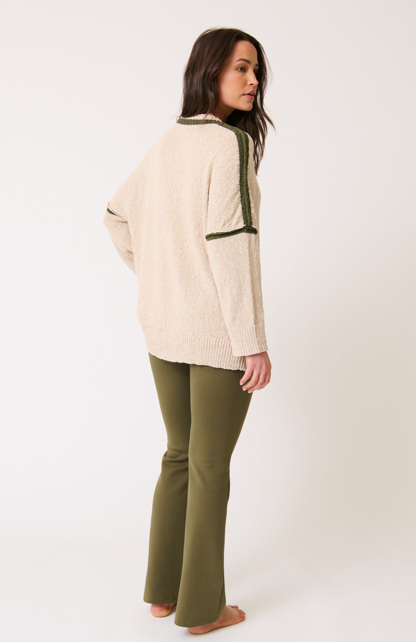 Hip length, relaxed oversized knit sweater with drop shoulder