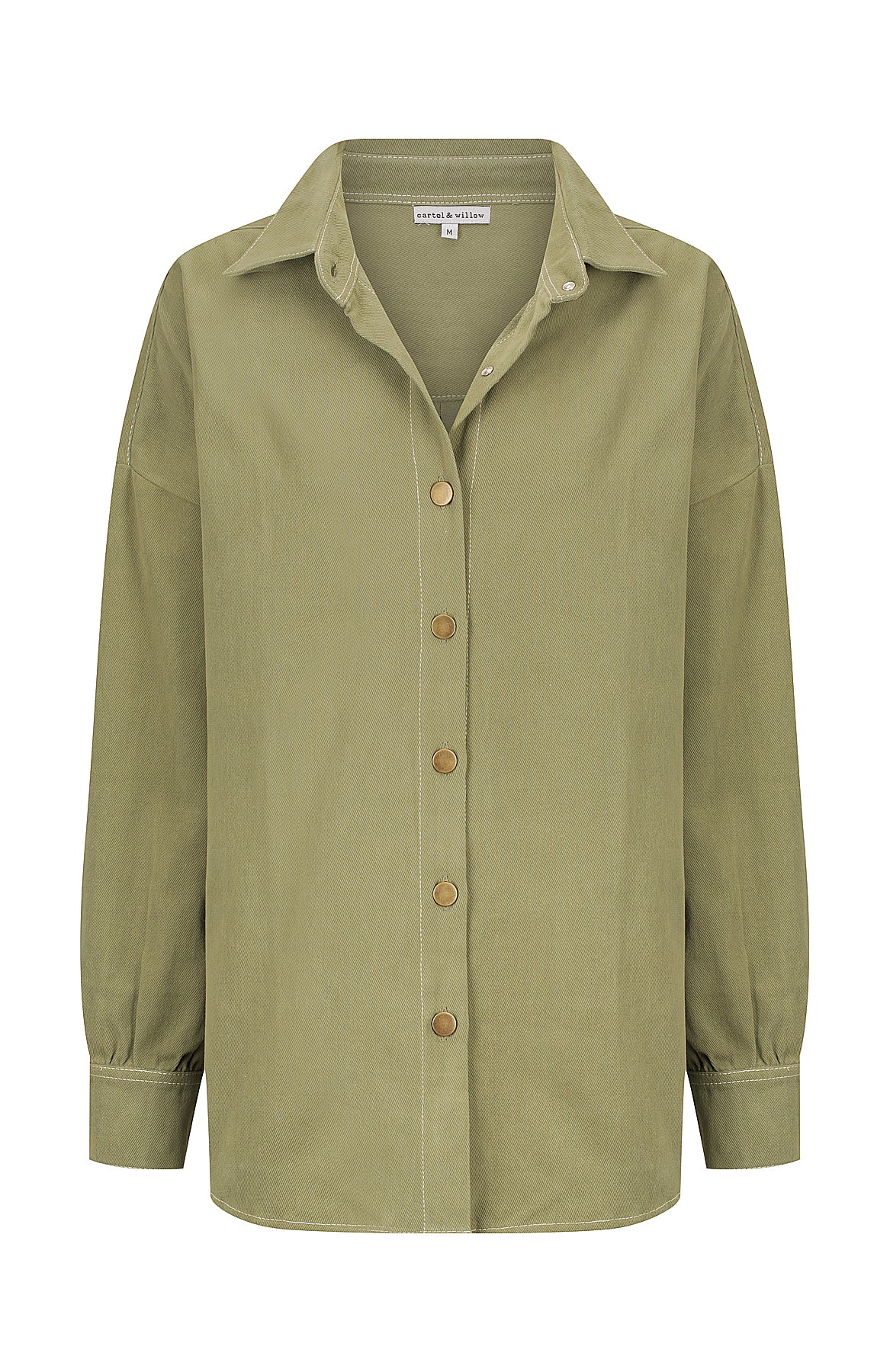 - Oversized fit, button front drill shirt