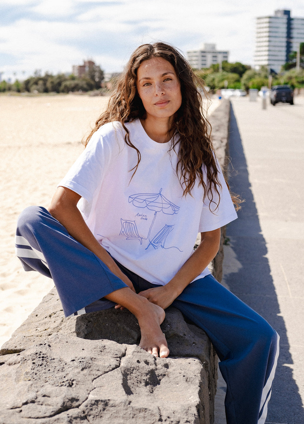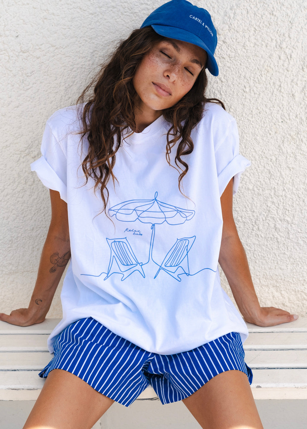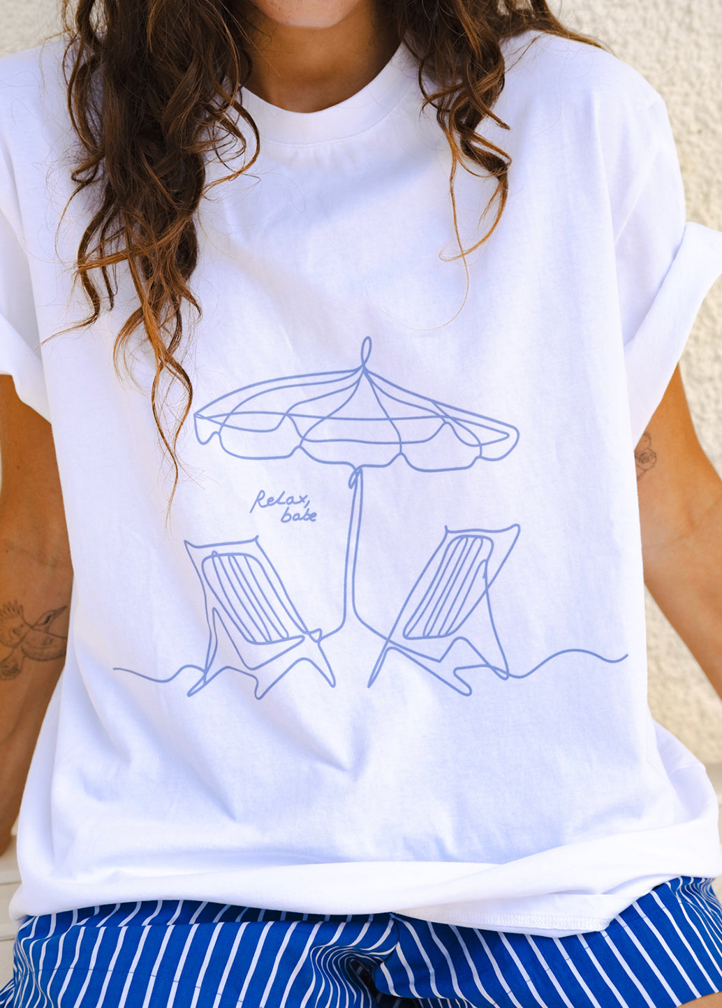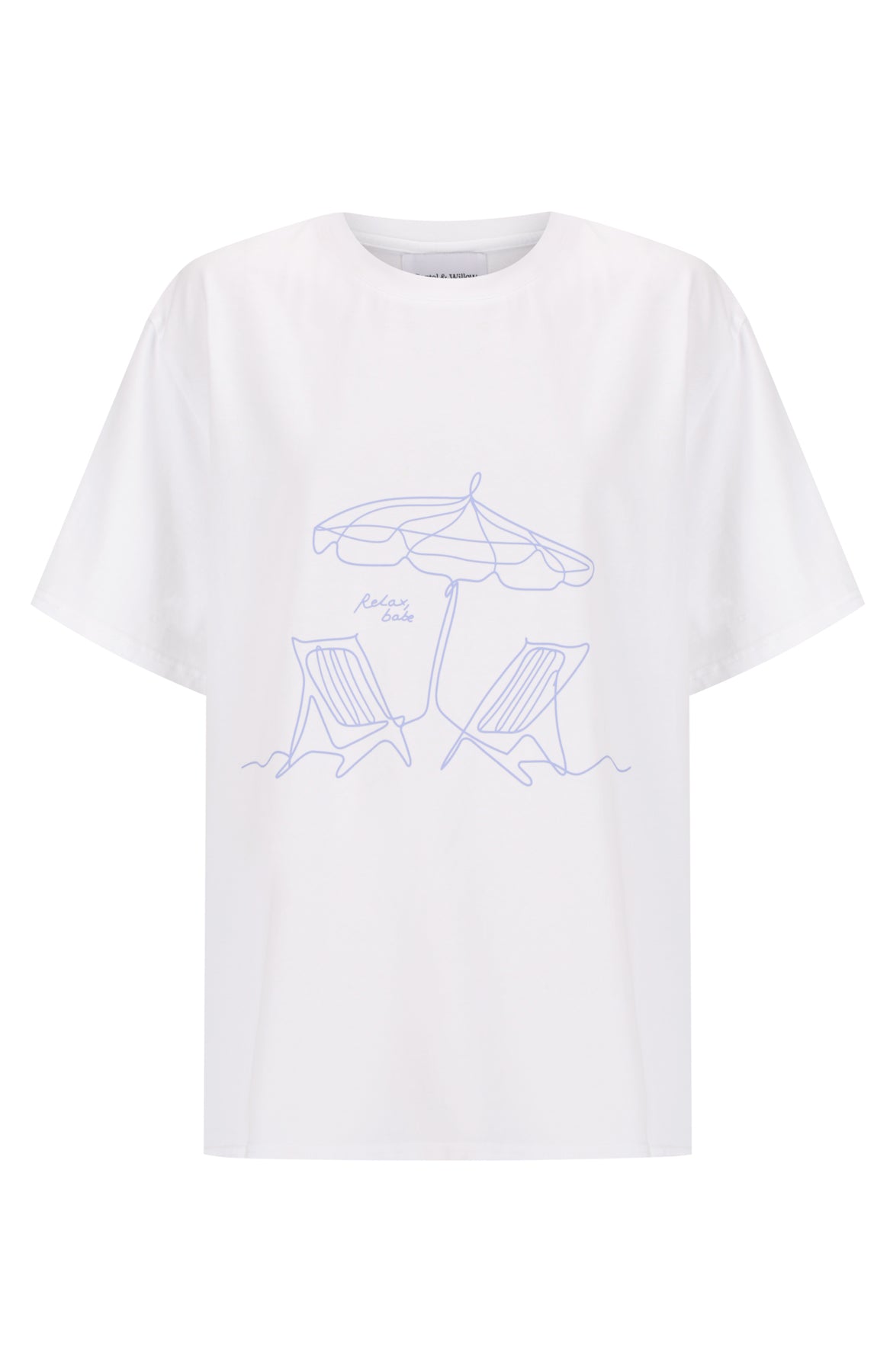• Colour:  White base with our feature ‘Relax, Babe’ printed graphic in Blue